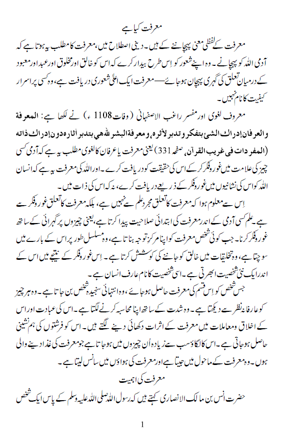 معرفت کے لفظی معنی پہچاننے کے ہیں۔ دینی اصطلاح میں معرفت کا مطلب یہ ہوتا ہے کہ آدمی اللہ کو پہچانے۔ وہ اپنے شعور کو اس طرح بیدار کرے کہ اس کو خالق اور مخلوق اور عبد اور معبود کے درمیان تعلق کی گہری پہچان ہوجاۓ- خدا کی معرفت اعلی شعوری در یافت کا نام ہے، خدا کی معرفت کسی پراسرار کیفیت کا نام نہیں۔
